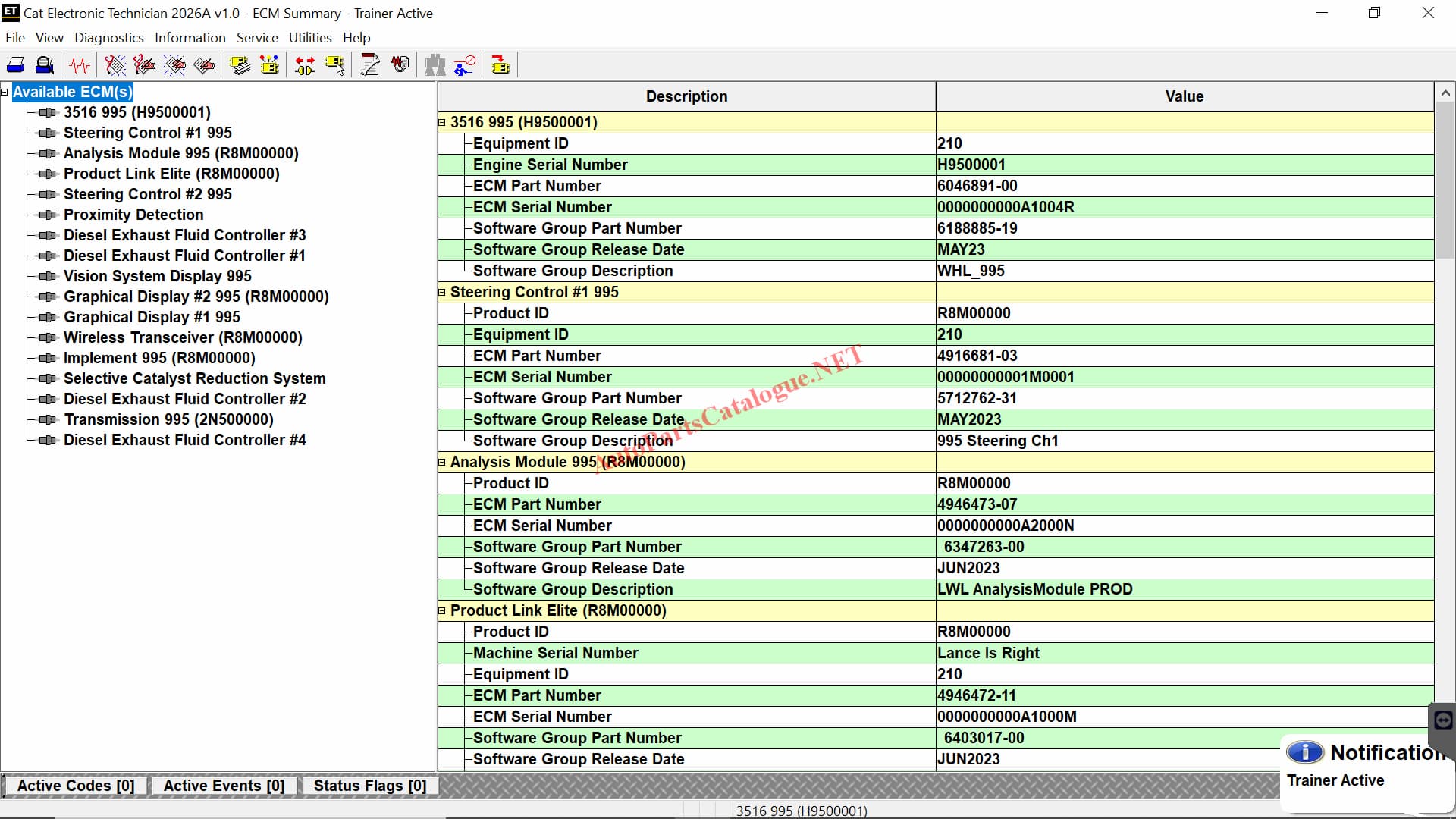 - Electronic Control Module (ECM) Information: Displays details about installed ECMs, including hardware, software versions, and serial numbers.