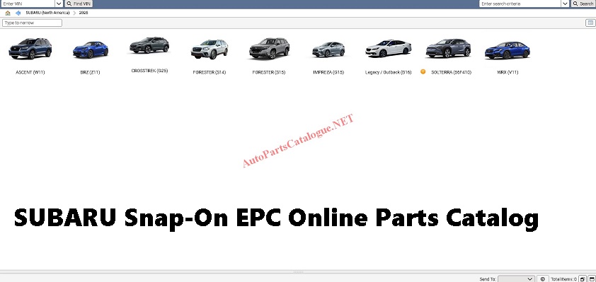 Subaru Snap-on EPC Online is a web-based parts catalog for Subaru vehicles worldwide. Access parts data, exploded diagrams, VIN decoder, and technical specifications through your browser.
